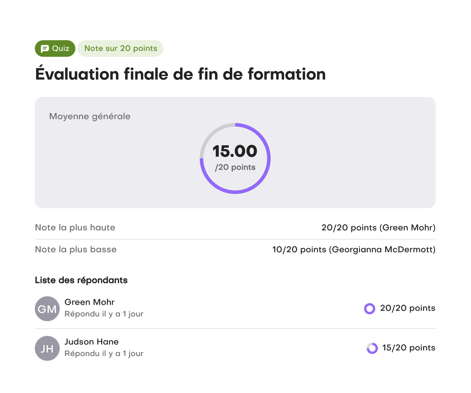 Il désormais possible d'évaluer les compétences de vos apprenants tout au long de vos sessions grâce à la création et l'envoi de quiz. Analysez ensuite les notes de chacun en quelques clics.